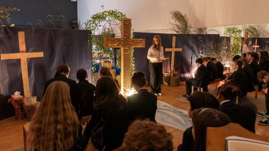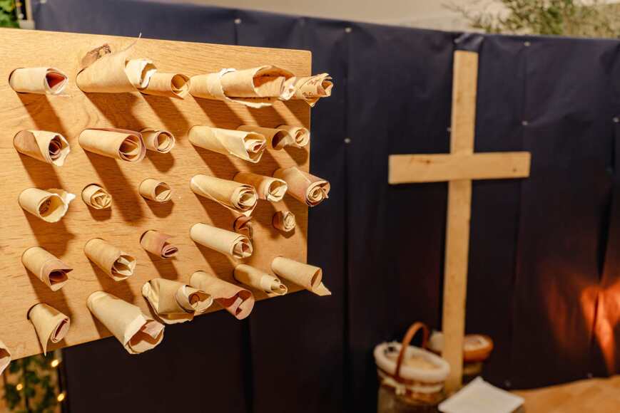 Heaven was explored through Jesus' response to the repentant thief on the cross ‘Today you will be with me in paradise’ (Luke 23:43). Students had an opportunity to reflect and respond by writing their prayers on scrolls and placing them within the pierced cross.