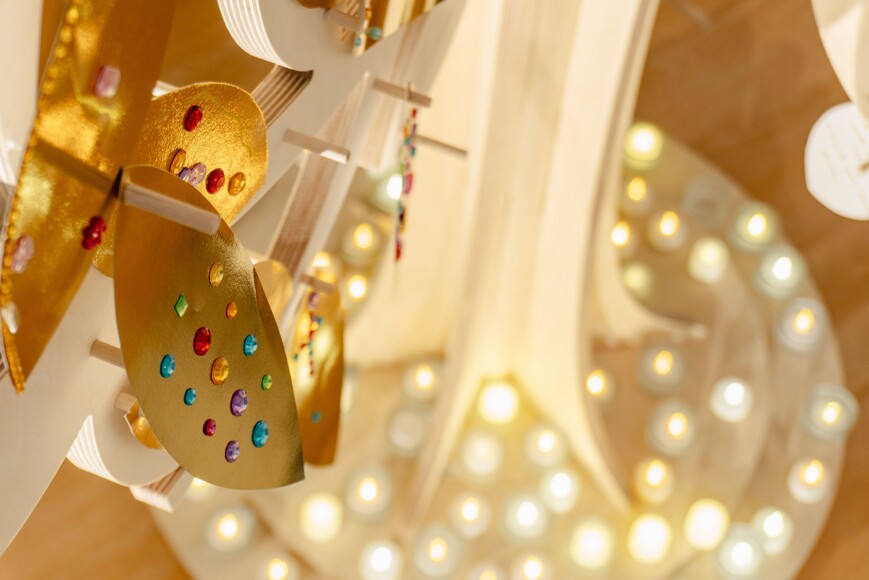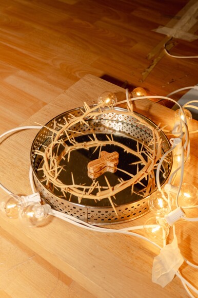 Trinity celebrated its 10 Year Anniversary in September 2023, and so the Prayer Space 2024 explored the meaning behind the school's name - The Holy Trinity. Taking inspiration from Andrei Rublev's Trinity artwork, we see the three persons of the Holy Trinity as equal and in perfect relationship with one another seated around a table. The challis in the centre represents the sacrifice of Jesus' blood for all mankind. The small rectangle at the bottom of the table, originally had a mirror on it. The artist wanted to capture the heart of The Holy Trinity to show the viewer that we are invited to the table and seated in the centre of this loving relationship.
